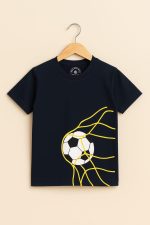 Kick off a winning look with the Goal Scorer Soccer Net T-Shirt! Designed for little football lovers, this trendy navy-blue t-shirt features a bold soccer ball and net graphic in white and yellow, capturing the excitement of scoring a goal. Made from soft and breathable cotton, it ensures all-day comfort, whether for playtime, sports practice, or casual outings. The round neckline and short sleeves provide a relaxed fit, making it an essential addition to any young athlete’s wardrobe.