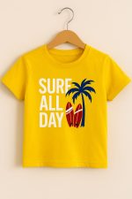 This fun and fresh yellow t-shirt is made for little adventurers who love the beach! The print features palm trees, red surfboards, and the words “SURF ALL DAY,” giving it a cool summer look.
